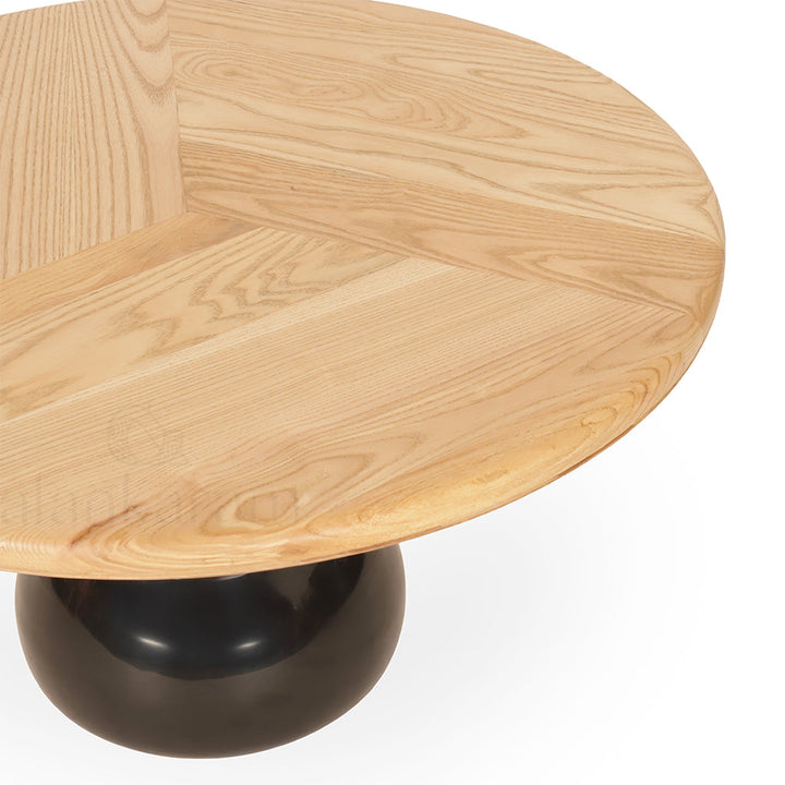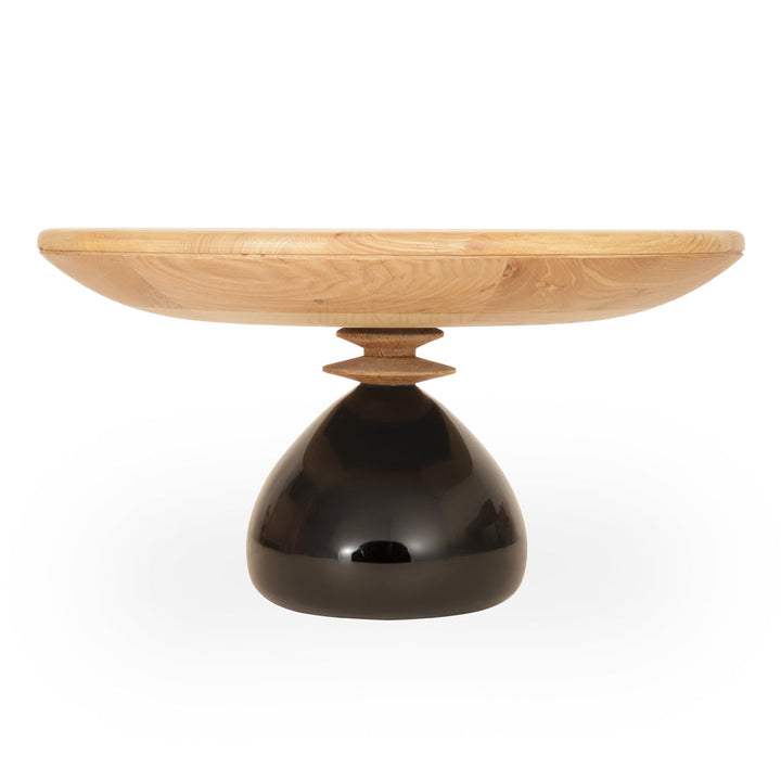 - Its base is a solid, glossy black form, shaped like a turned spindle or a large top, creating a modern and sculptural effect that grounds the table with a touch of gravity and grace.