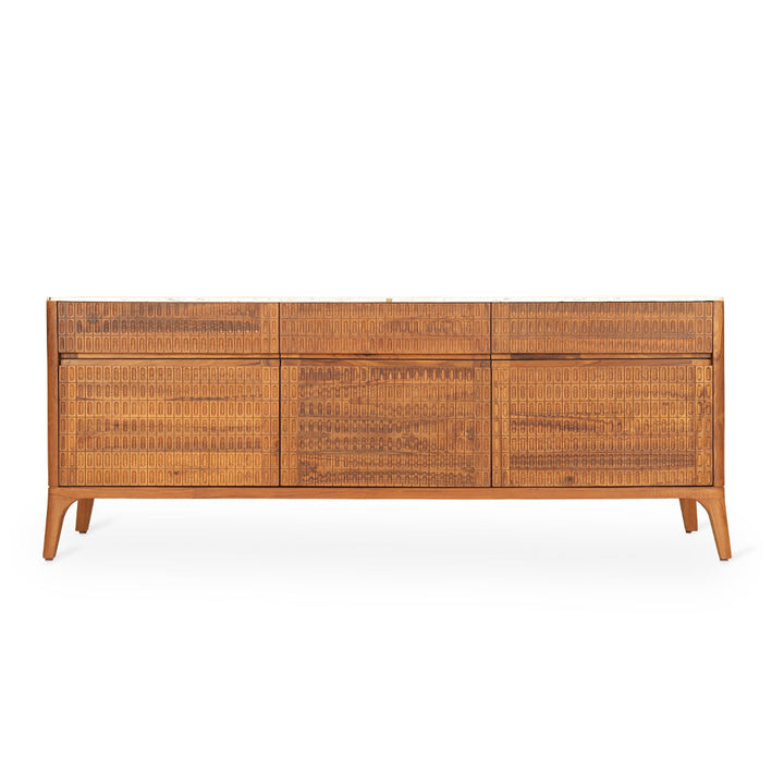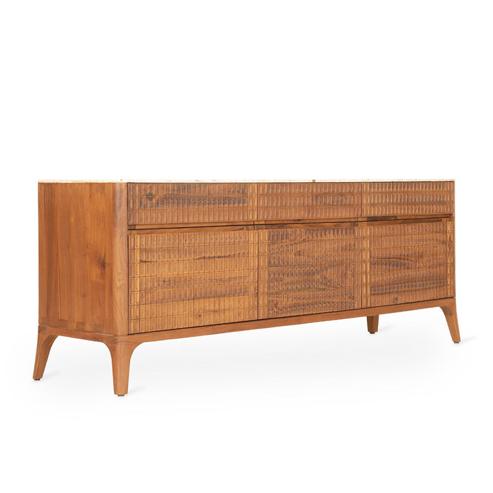 - This sophisticated teakwood cabinet is crowned with a luxurious stone top, featuring a striking vein pattern that adds an element of modern art to the piece.