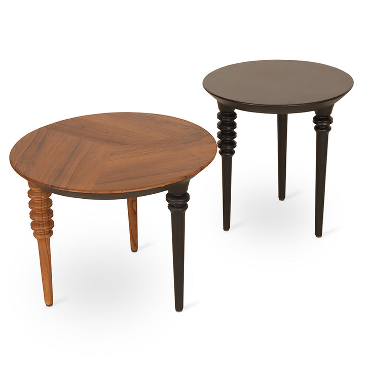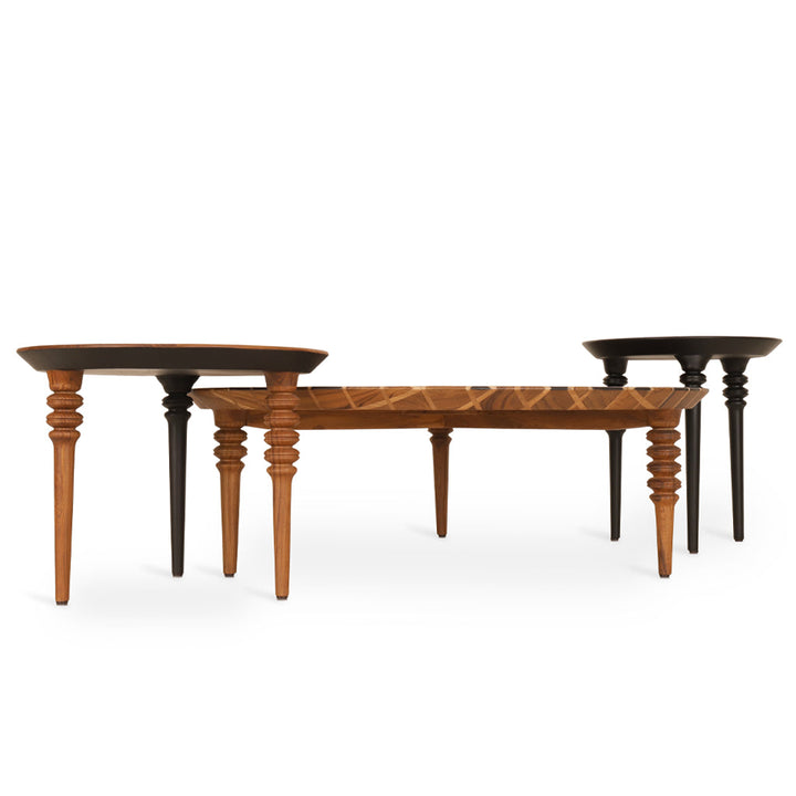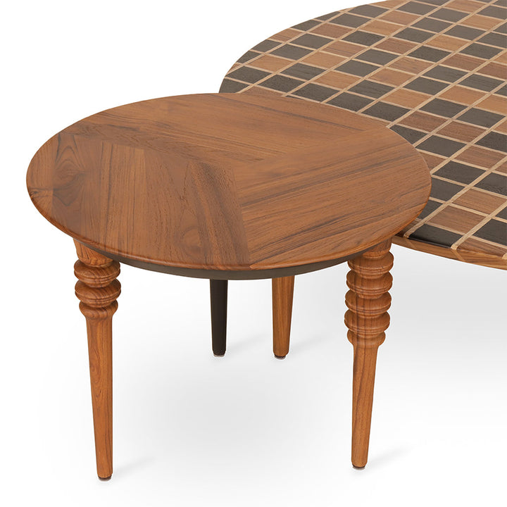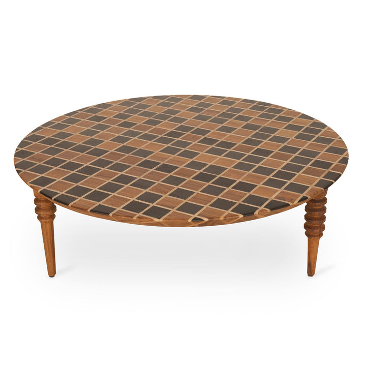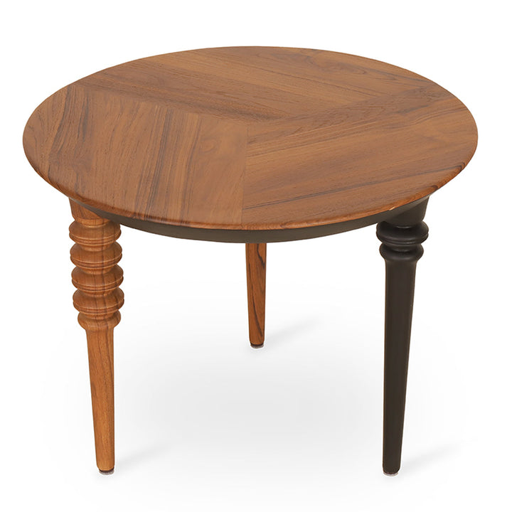 Derived from the Czech word "karovy," meaning "square-patterned," the Karovy Center Table is a fusion of tradition and contemporary artistry. Crafted from solid teakwood, its circular form is accentuated by brass inlays, adding an elegant contrast. The intricately carved legs showcase diverse patterns, creating a statement of craftsmanship. Ideal for living rooms, lounges, and commercial spaces, this table blends durability with design. Customizable in size and finish, it effortlessly complements both modern and classic interiors.