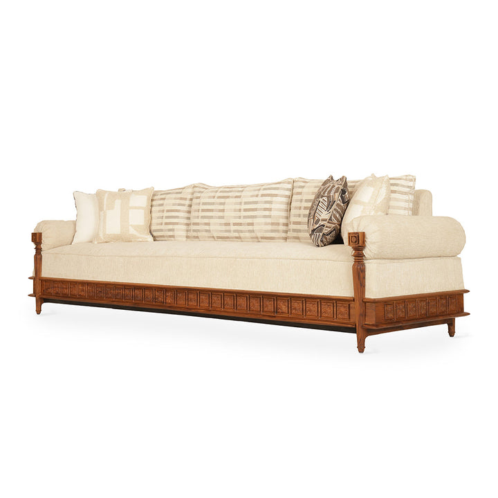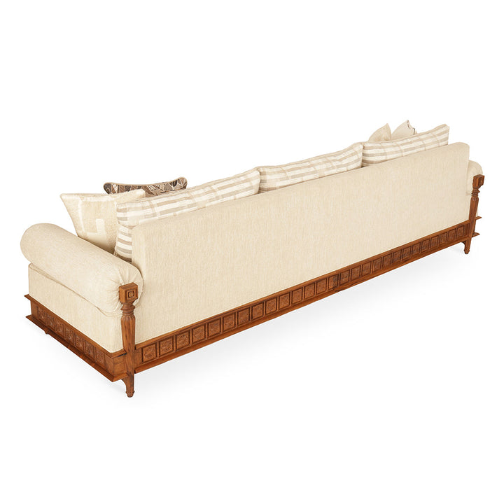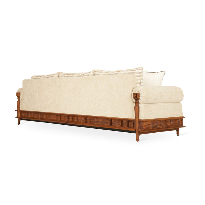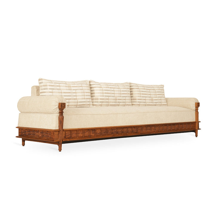 - This sofa is a classic fusion of traditional charm and modern comfort, featuring a sturdy teakwood frame with ornate carvings.