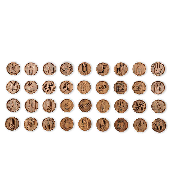 - This teakwood wall art features a collection of intricately carved circular plaques, each depicting a unique hand gesture.