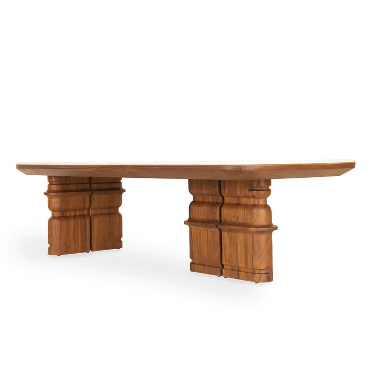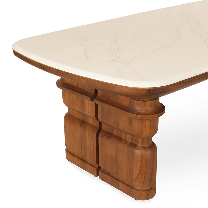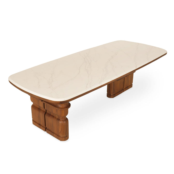 The sculptural teakwood base, inspired by classical forms, anchors the table with a quiet boldness, while the smooth quartz top introduces a refined modern touch.