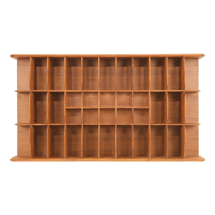 Designed to accommodate books, artefacts, or collectables, its grid-like yet flowing structure makes it a centrepiece for any living or work space.
