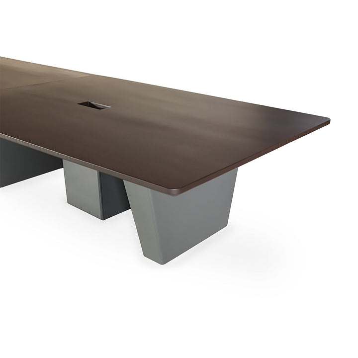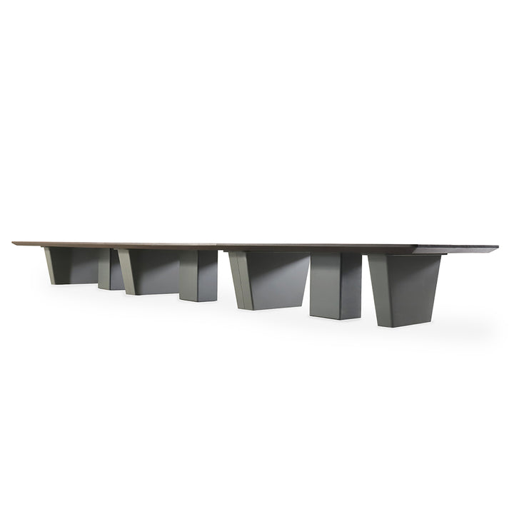 Its elongated surface comfortably accommodates large teams, while the geometric pedestal bases provide both strength and sculptural elegance.