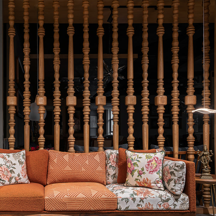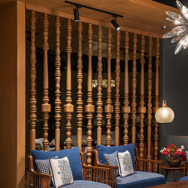 This exquisite wooden partition is crafted from individual solid wood bars, meticulously turned to showcase their natural beauty and intricate detailing.