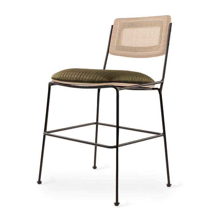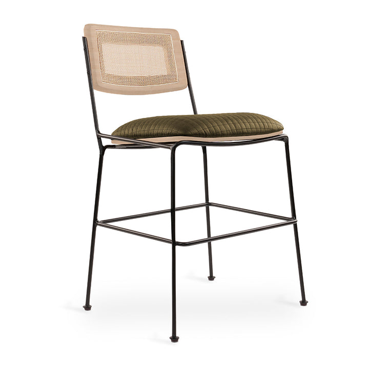 - The backrest is crafted from woven rattan material, providing a touch of organic texture contrasted against the industrial metal.